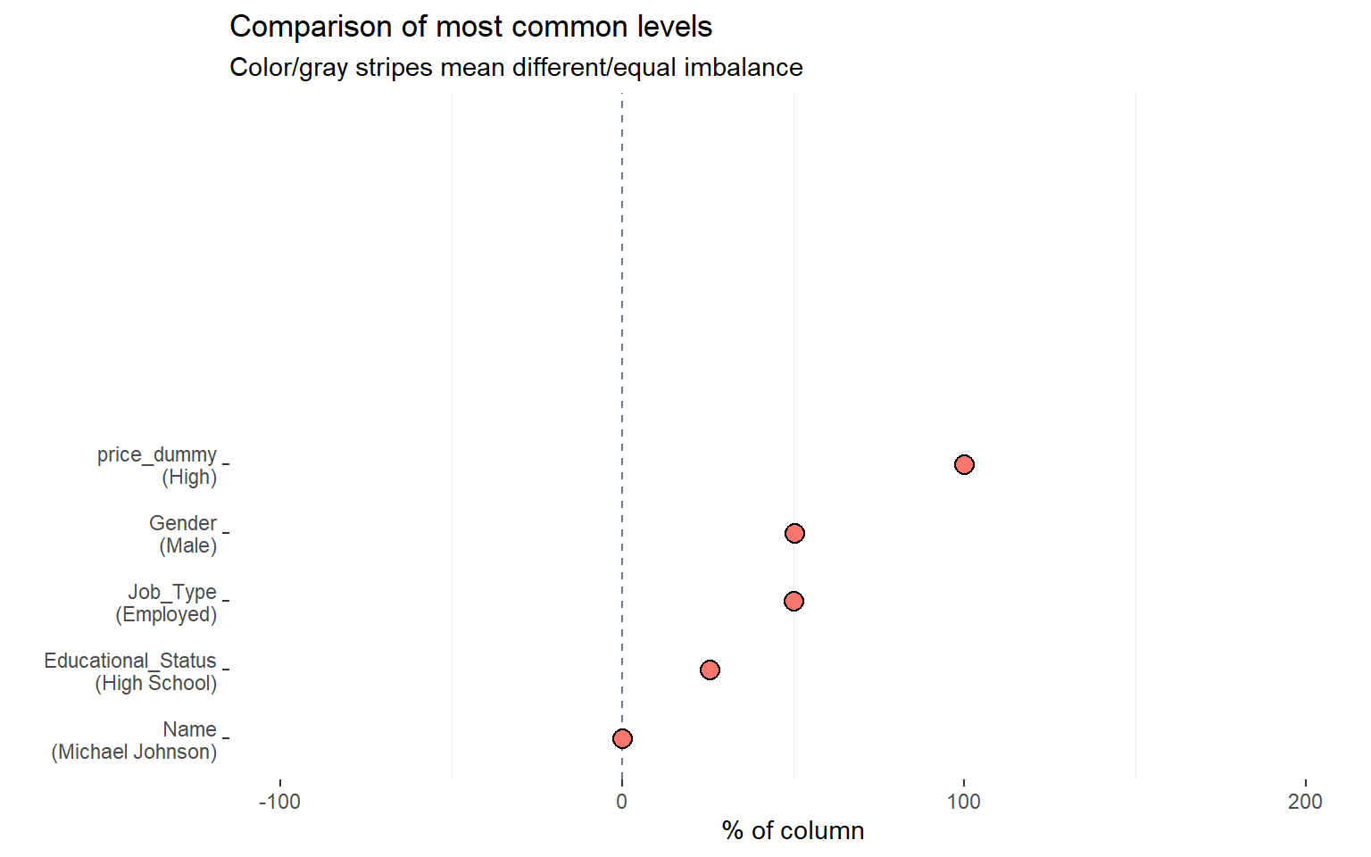# Comparación del desbalance categórico entre dos subgruposinspect_imb(data_price_dummy %>%filter(price_dummy =="High"), data_price_dummy %>%filter(price_dummy =="Low")) %>%show_plot() +theme(legend.position ="none")
