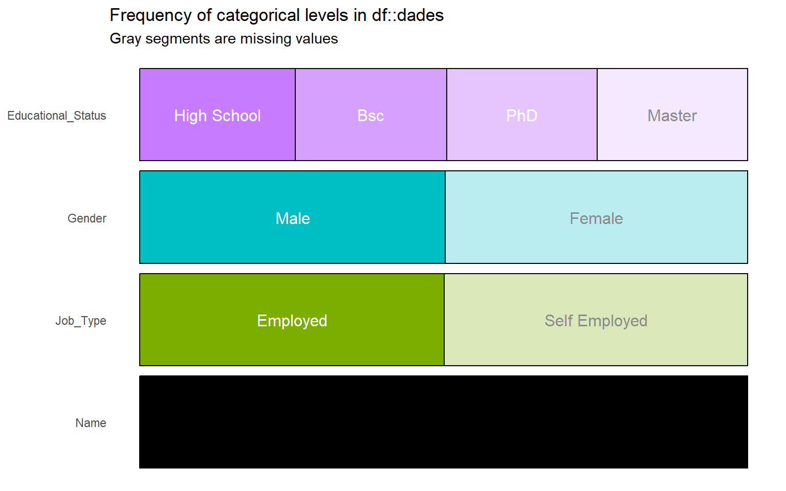# Visualización completa de todas las categorías presentes en cada variable cualitativainspect_cat(dades) %>%show_plot()