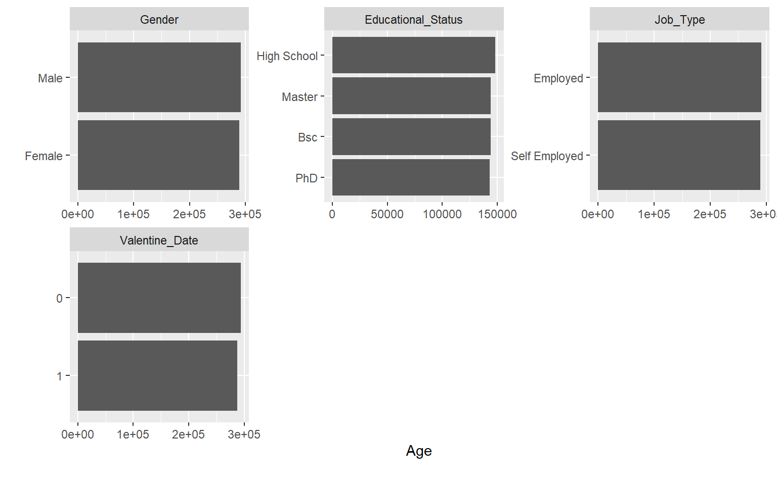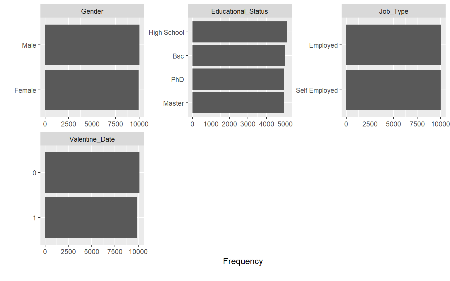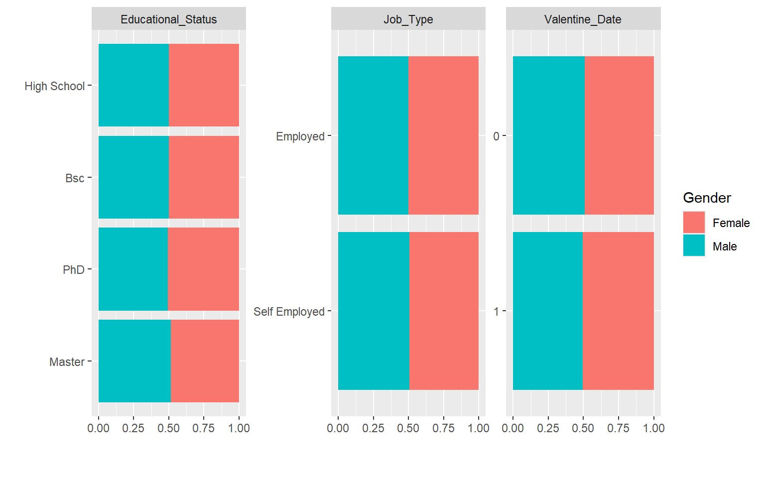 # De nuevo, representación visual de variables categóricas en formato apiladoExpCatViz( dades,target ="Valentine_Date",fname =NULL,clim =10,col =NULL,margin =2,Page =c(2, 1),sample =2)