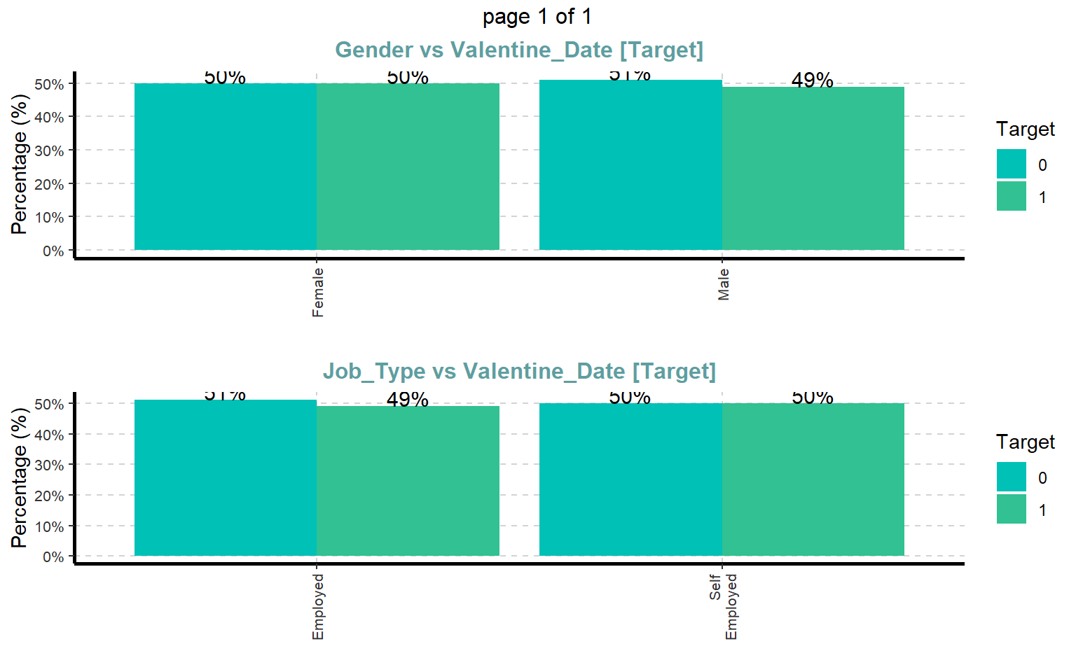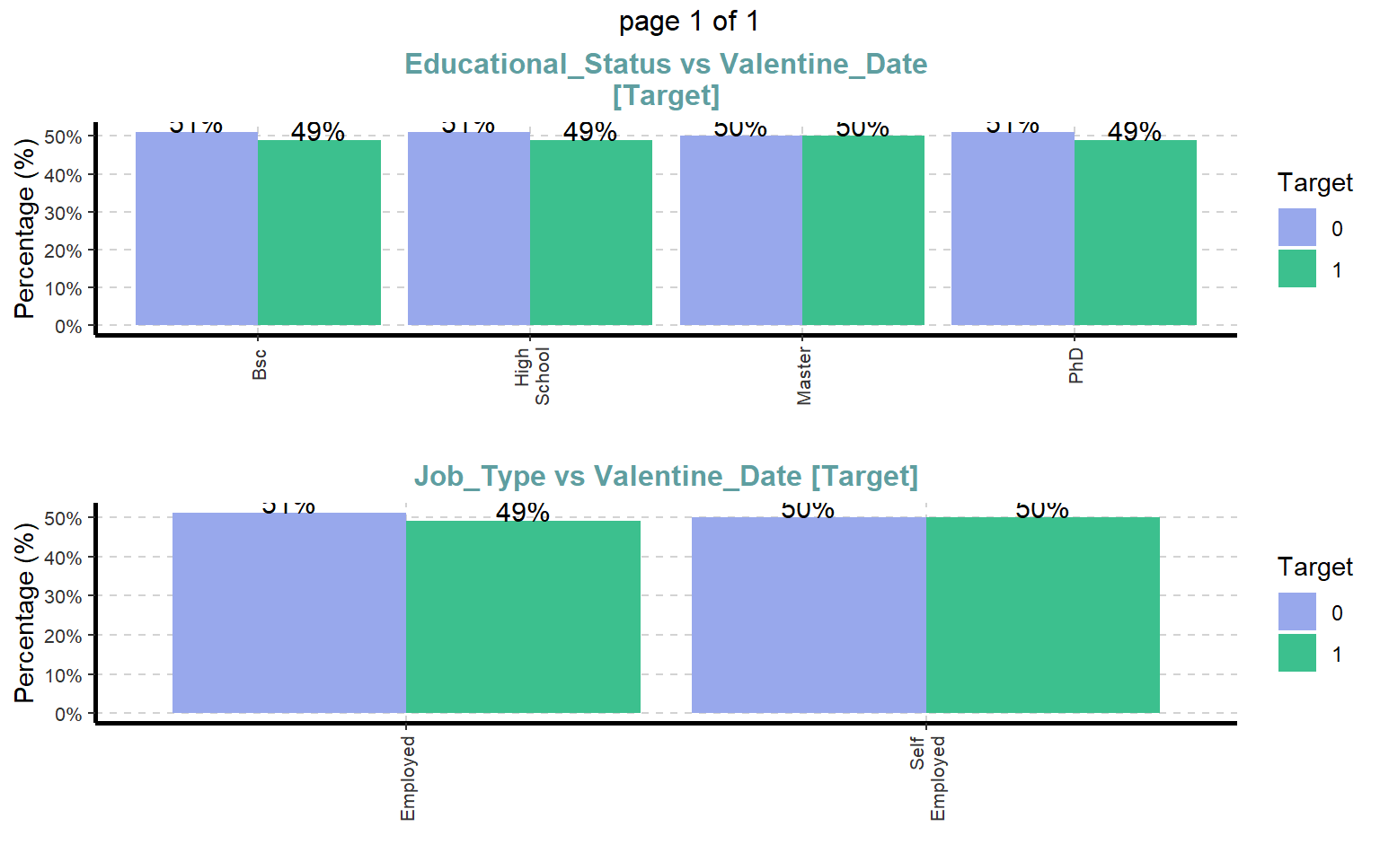# Gráficos de barras para variables categóricas respecto a la variable objetivoExpCatViz( dades,target ="Valentine_Date",fname =NULL,clim =10,col =NULL,margin =2,Page =c(2, 1),sample =2)