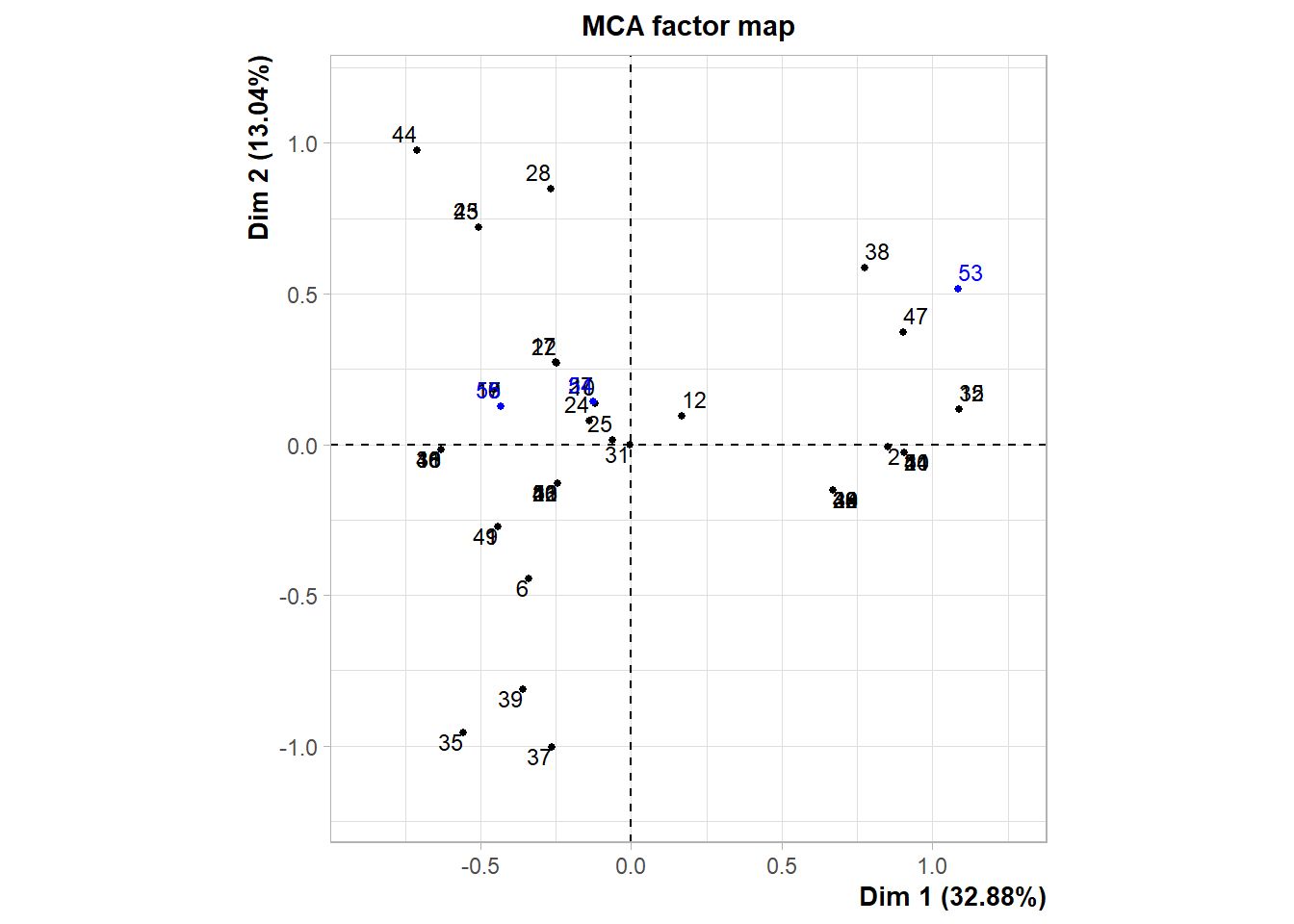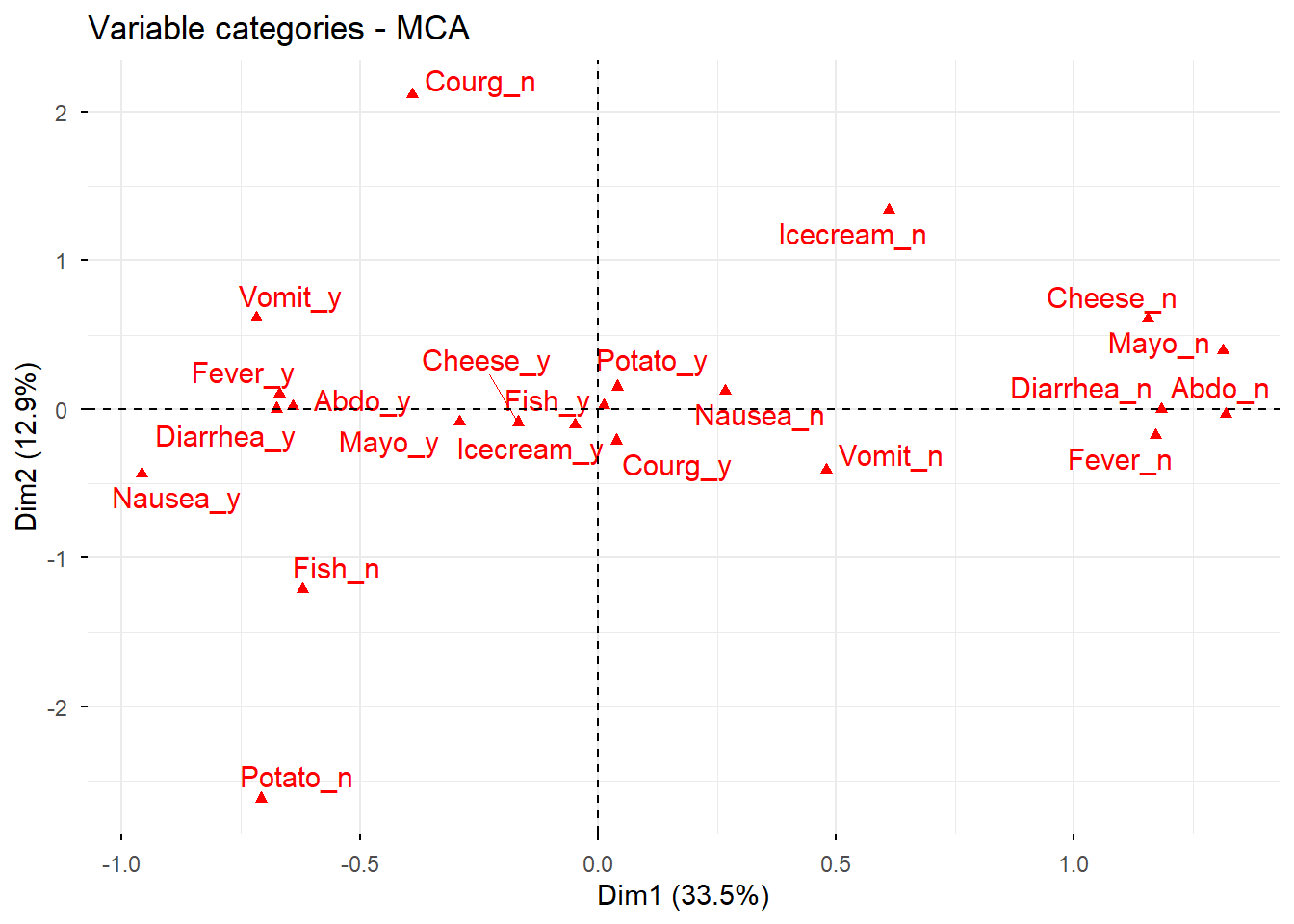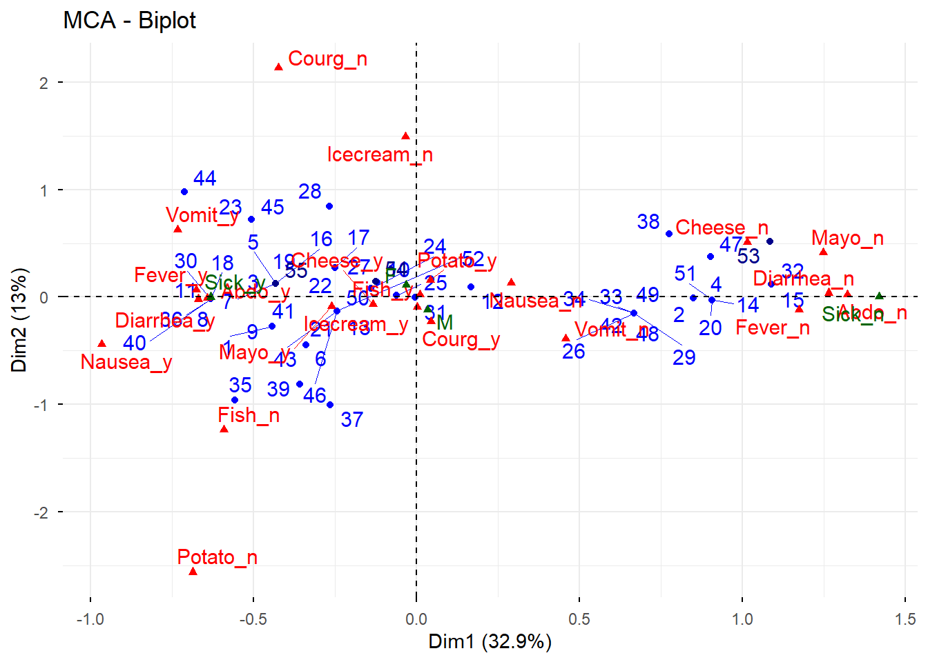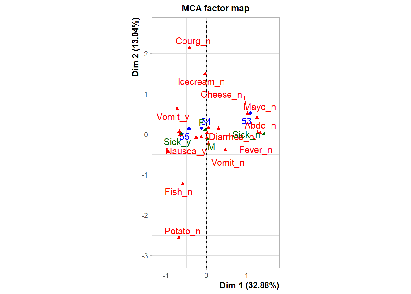 # Nuevo ACM incluyendo variables suplementarias e individuos suplementariosres.mca <-MCA( poison,ind.sup =53:55,quanti.sup =1:2,quali.sup =3:4,graph =FALSE)