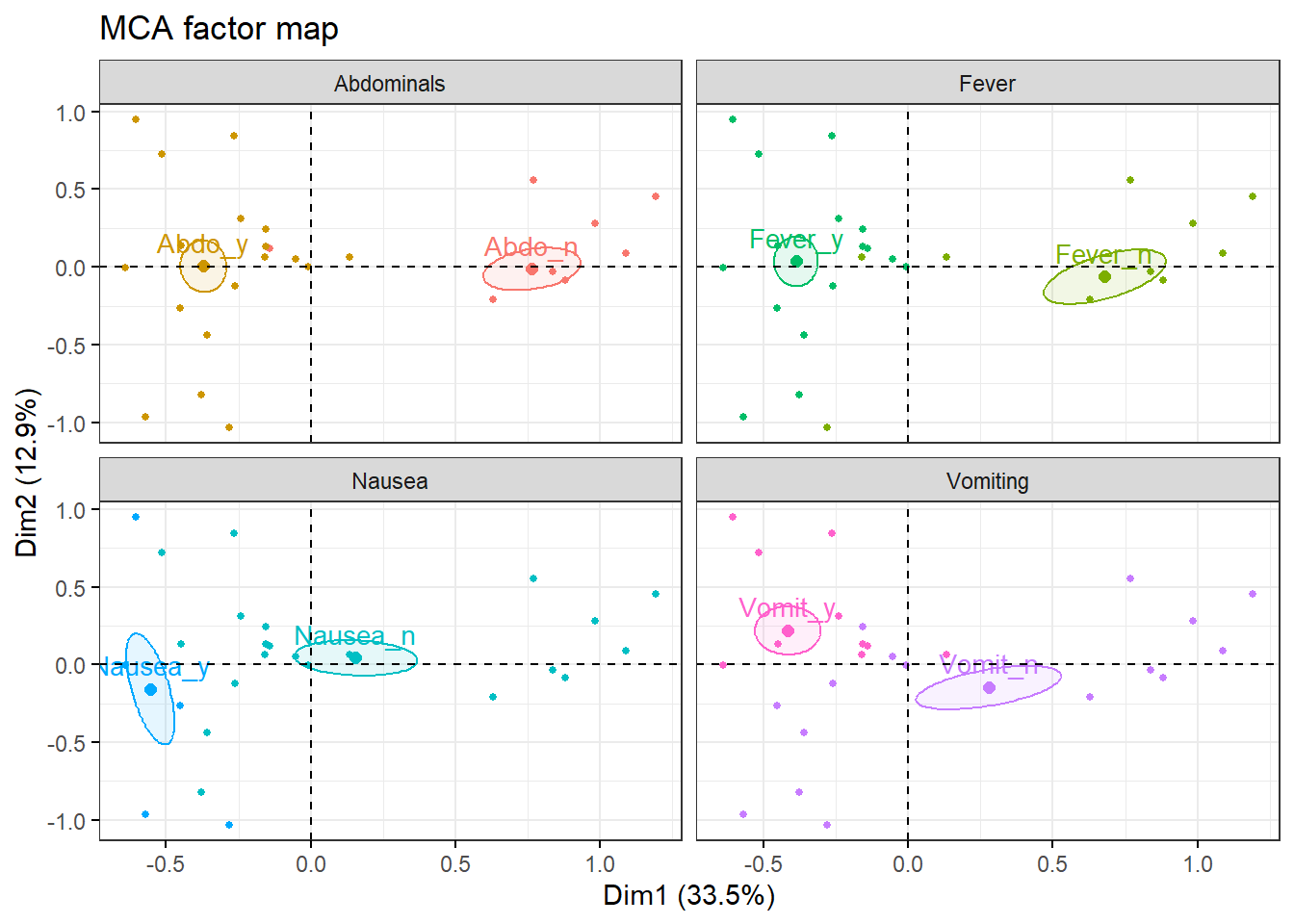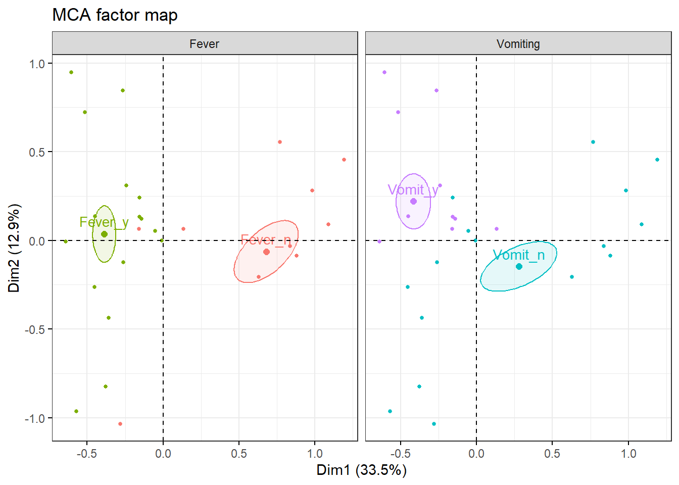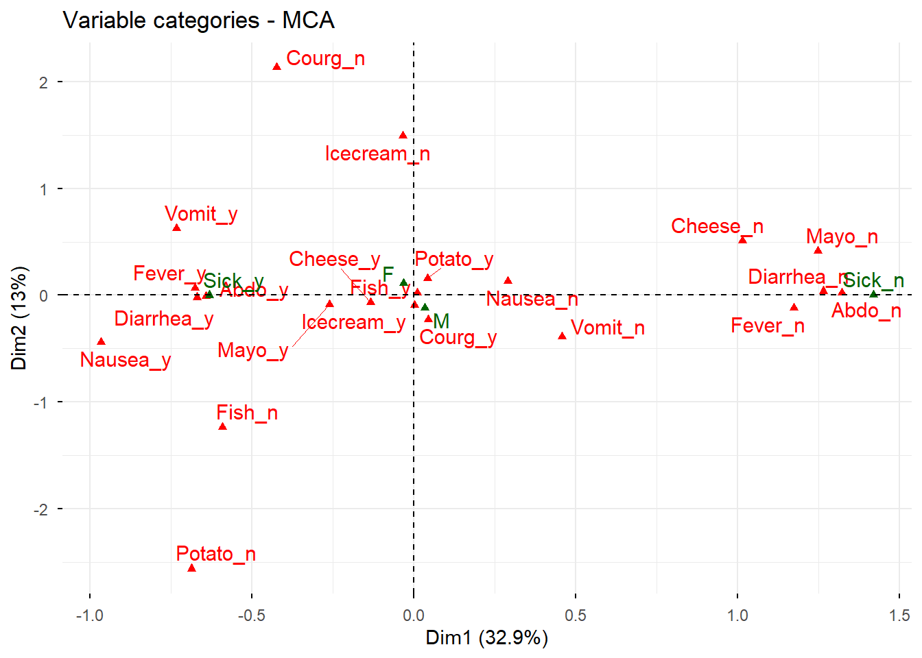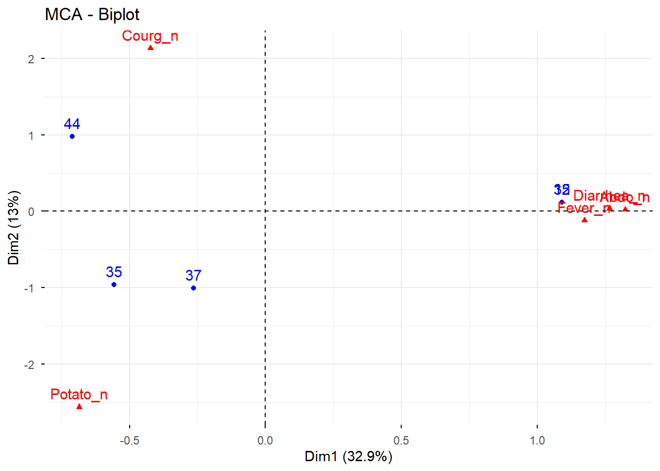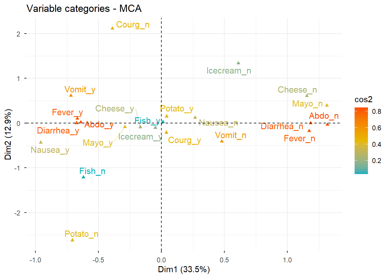 # Nuevo ACM incluyendo variables suplementarias e individuos suplementariosres.mca <-MCA( poison,ind.sup =53:55,quanti.sup =1:2,quali.sup =3:4,graph =FALSE)