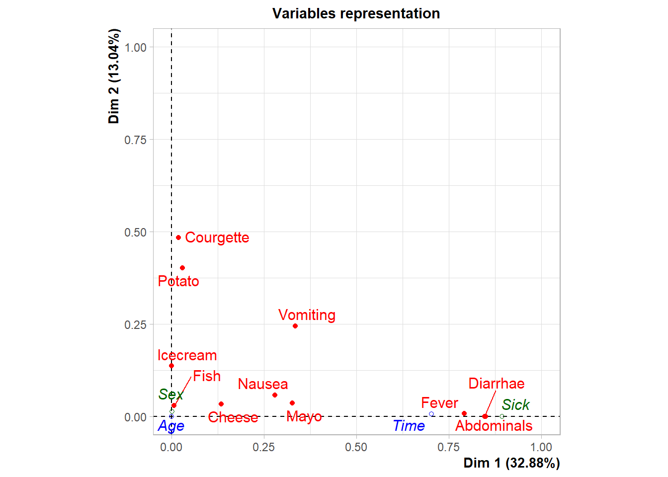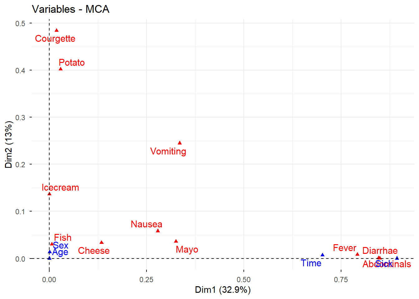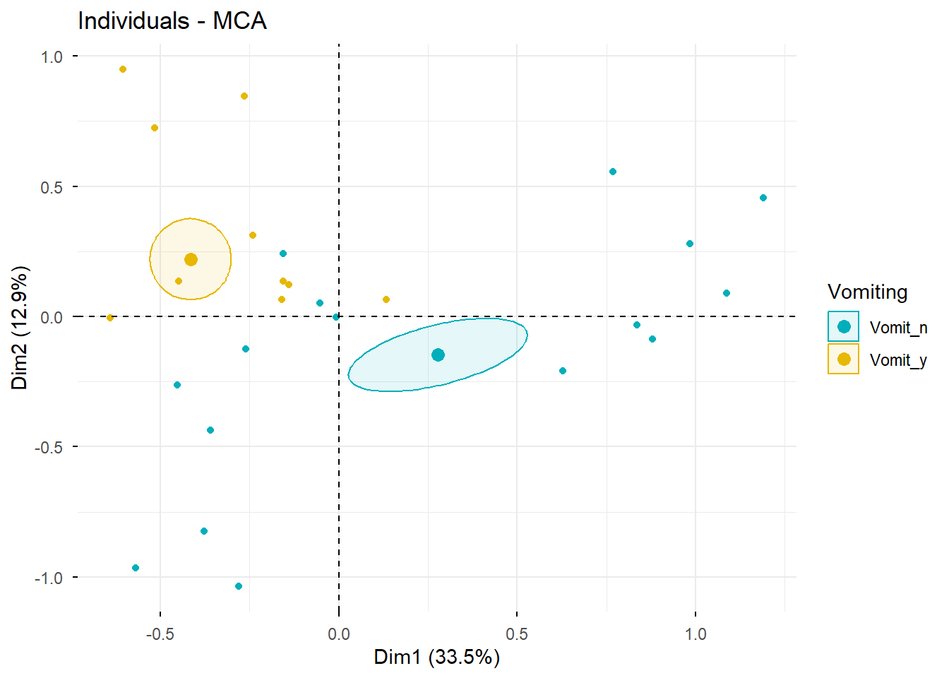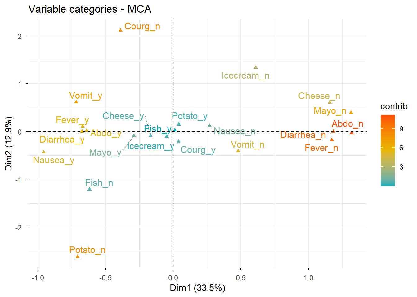 # Nuevo ACM incluyendo variables suplementarias e individuos suplementariosres.mca <-MCA( poison,ind.sup =53:55,quanti.sup =1:2,quali.sup =3:4,graph =FALSE)