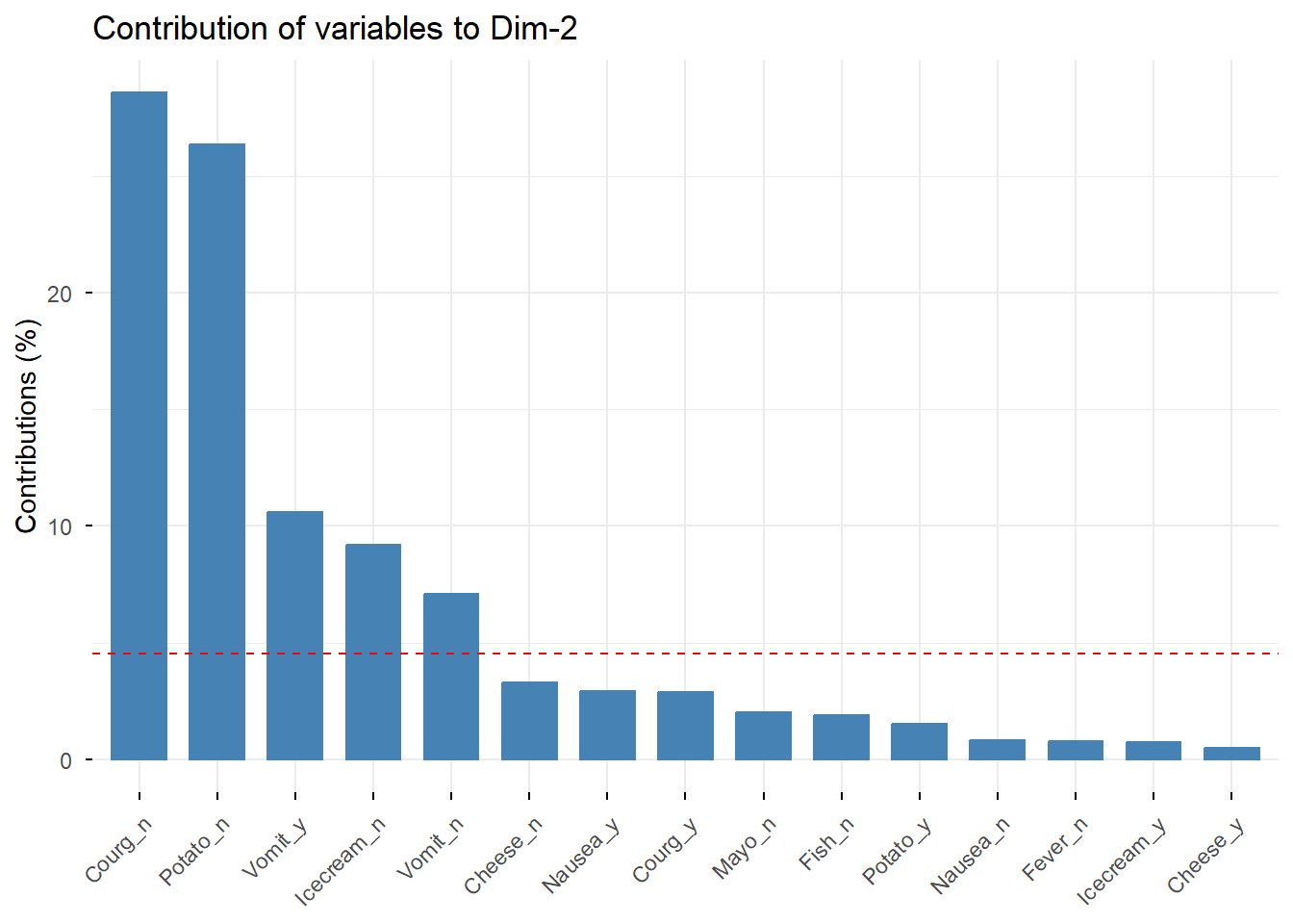# Cargamos el conjunto de datos de ejemplo incluido en FactoMineRdata(poison)# Dimensión del dataset: número de filas y columnasdim(poison)