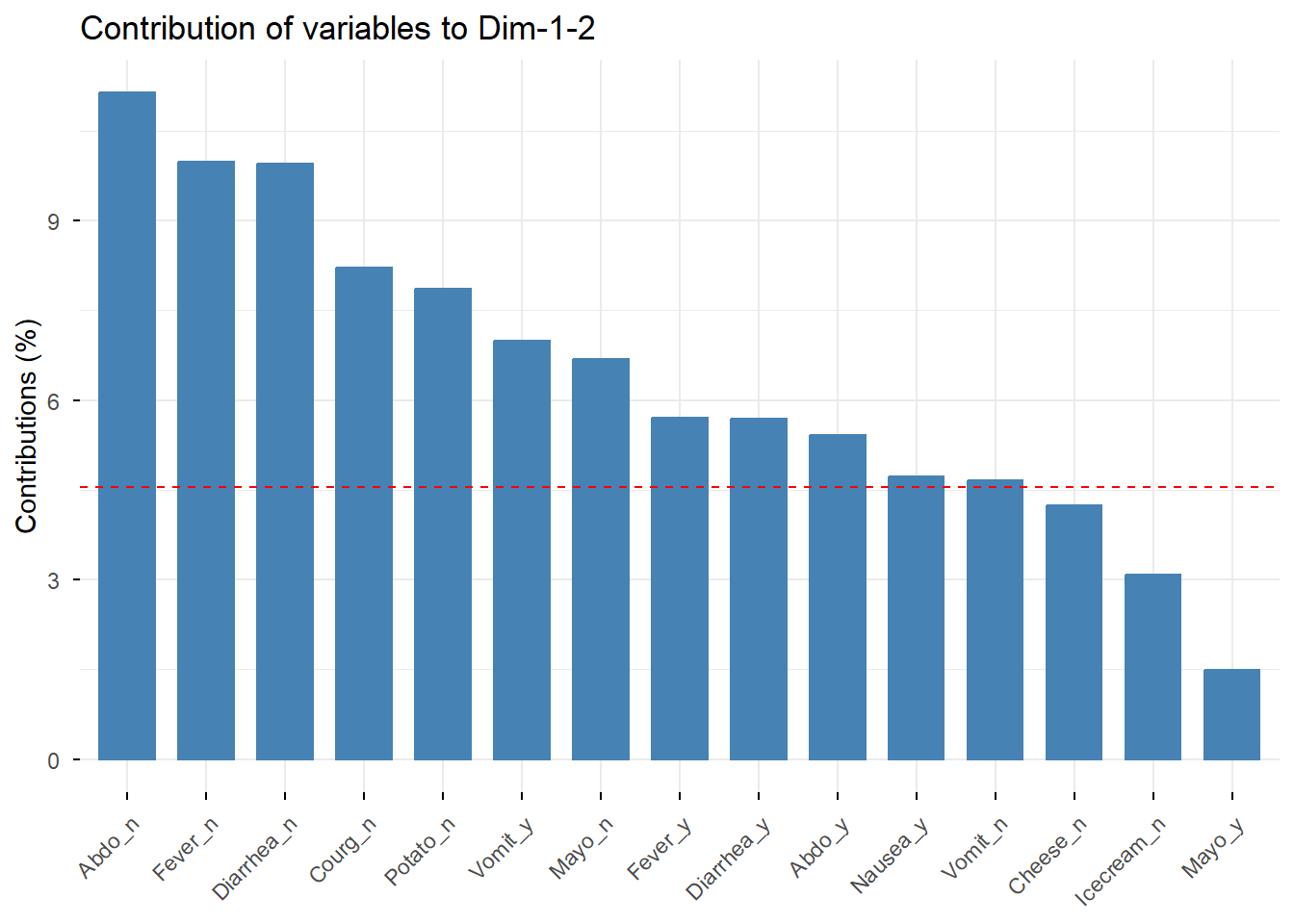 # Seleccionamos los individuos 1:55 y las variables 5:15# Estas serán las variables activas del análisispoison.active <- poison[1:55, 5:15]