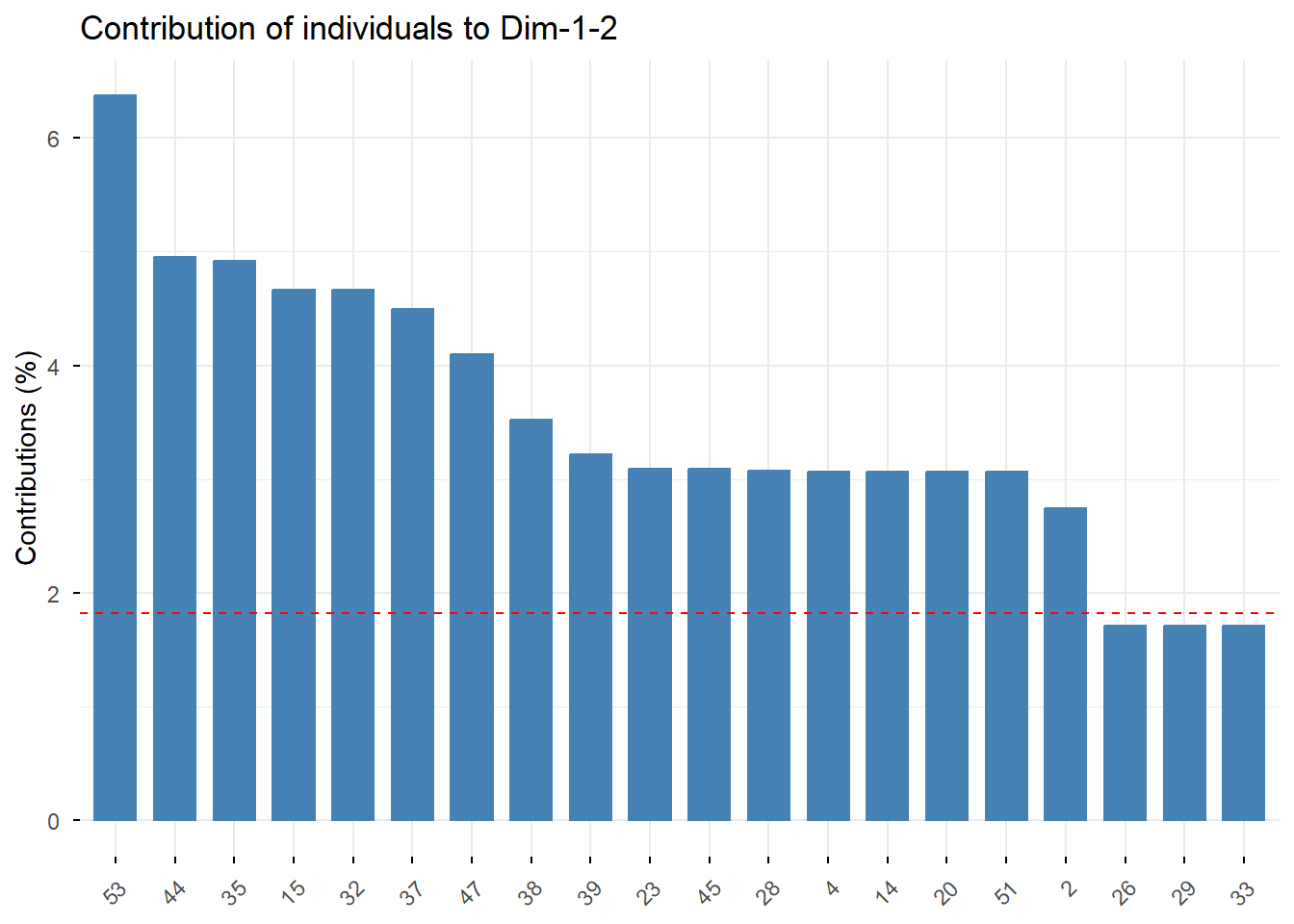 Ahora estudiamos la representación de los individuos en el espacio factorial.