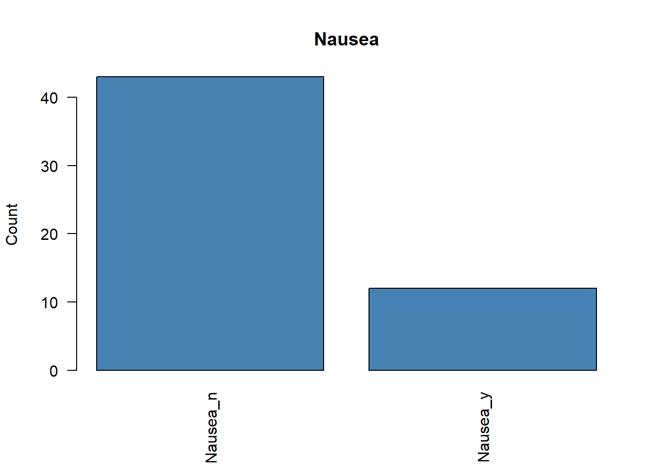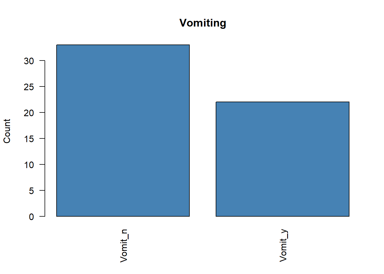 Min. : 4.00 Min. : 0.00 Sick_n:17 F:28 Nausea_n:43 Vomit_n:33