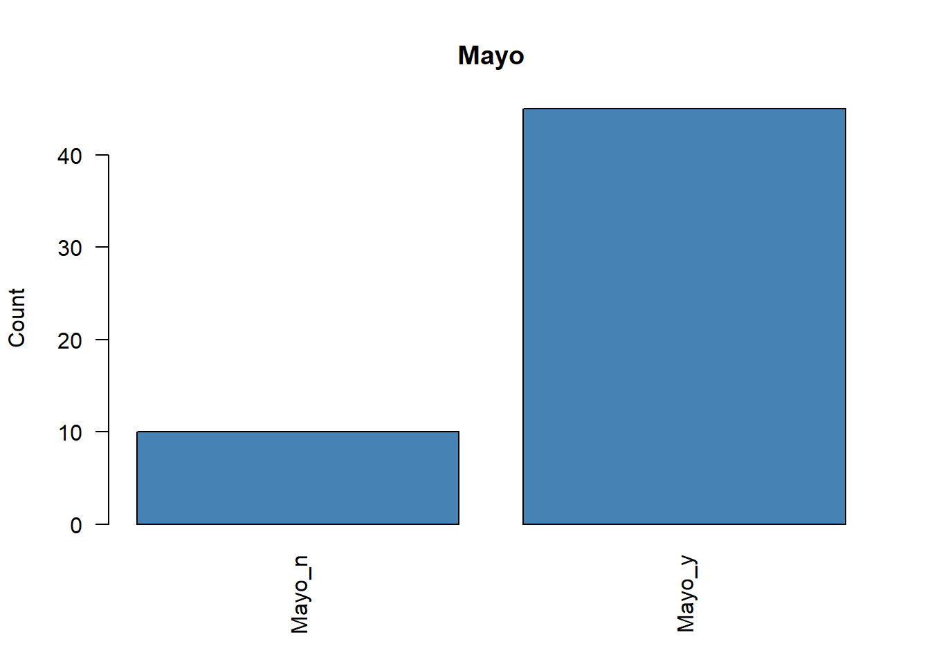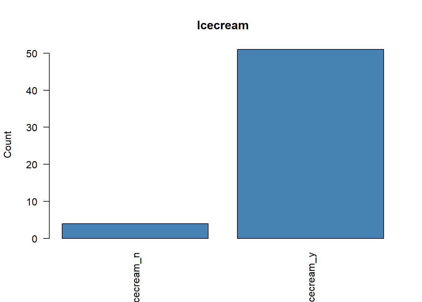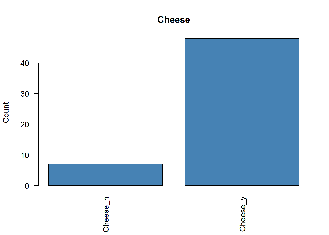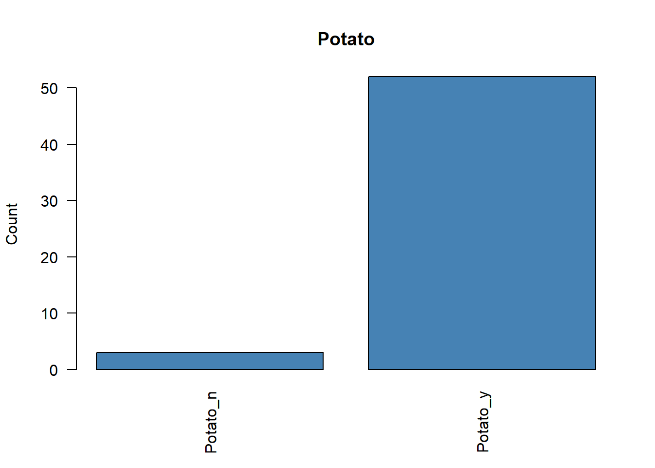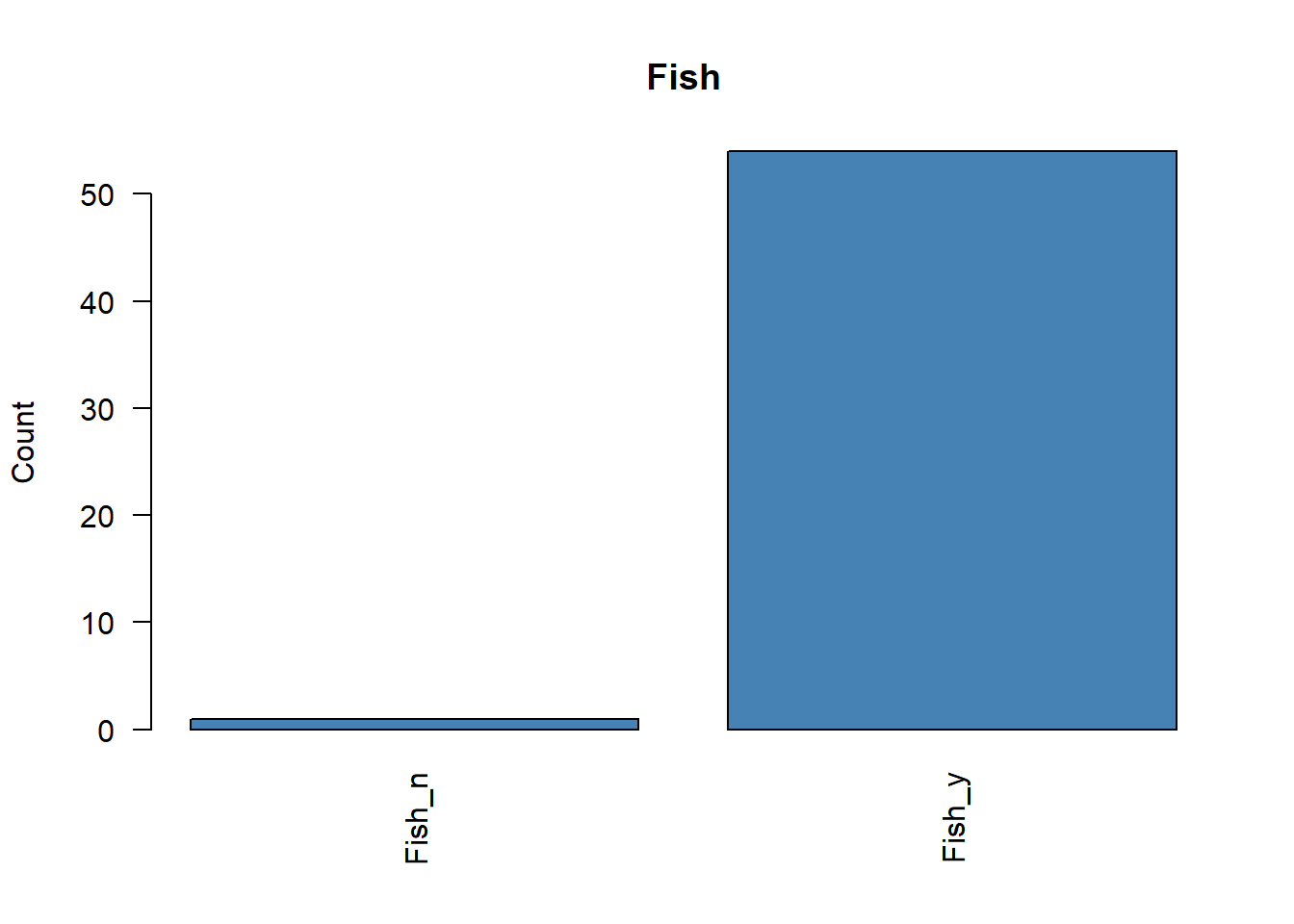 # Representamos la frecuencia de cada variable categóricafor (i in1:ncol(poison.active)) {plot( poison.active[, i],main =colnames(poison.active)[i],ylab ="Count",col ="steelblue",las =2 )}