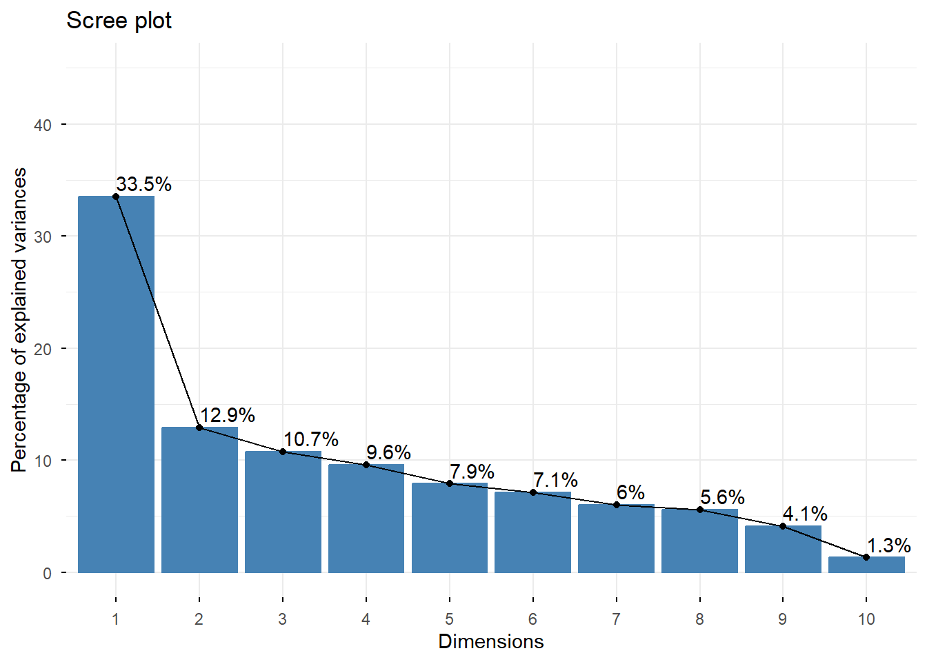 # Scree plot para visualizar la importancia relativa de las dimensionesfviz_screeplot(res.mca, addlabels =TRUE, ylim =c(0, 45))