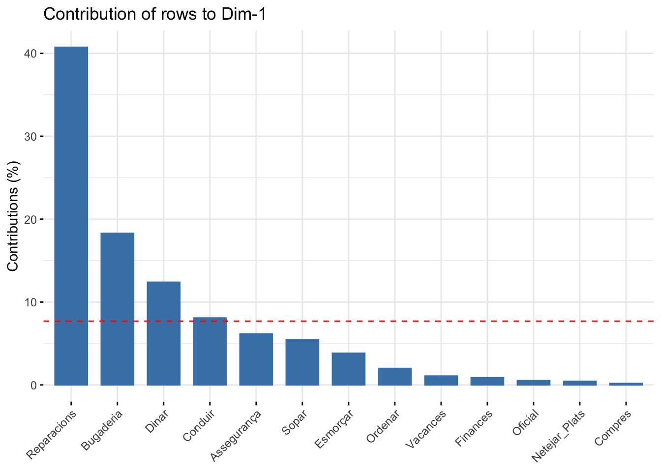 fviz_contrib(housetasks_CA, choice = "row" ,axes = 1)