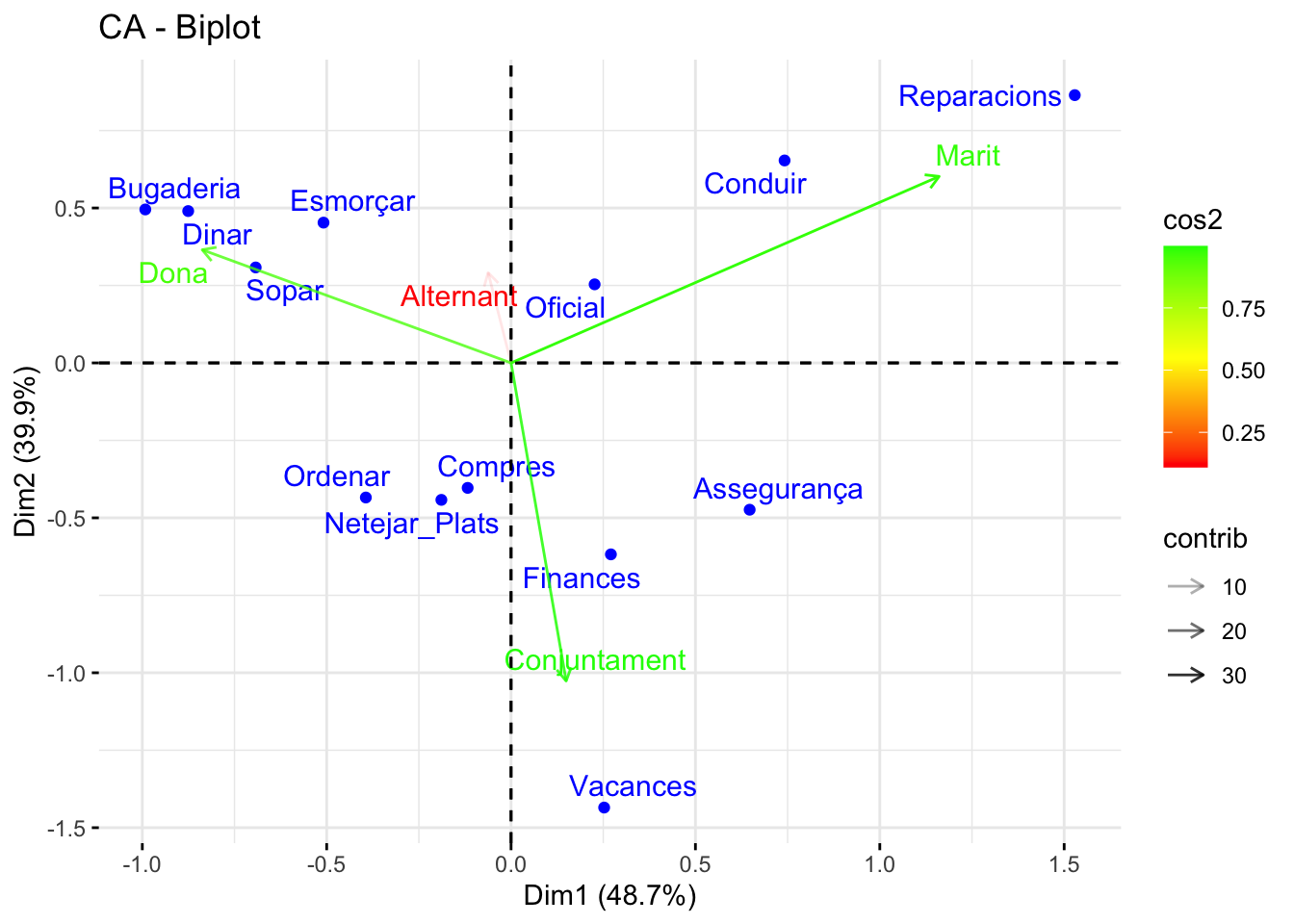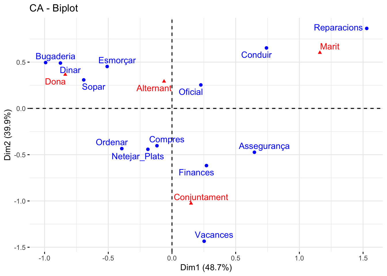 print(housetasks_CA)**Results of the Correspondence Analysis (CA)**