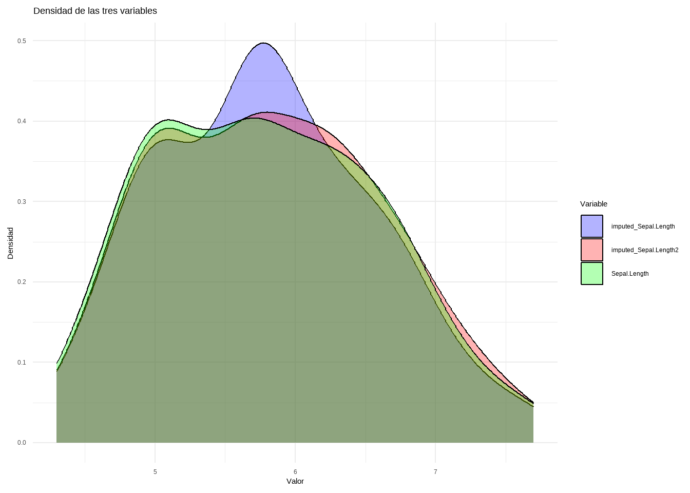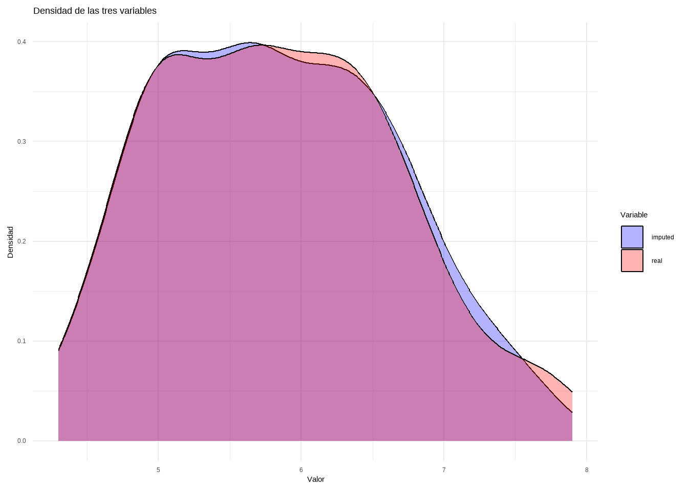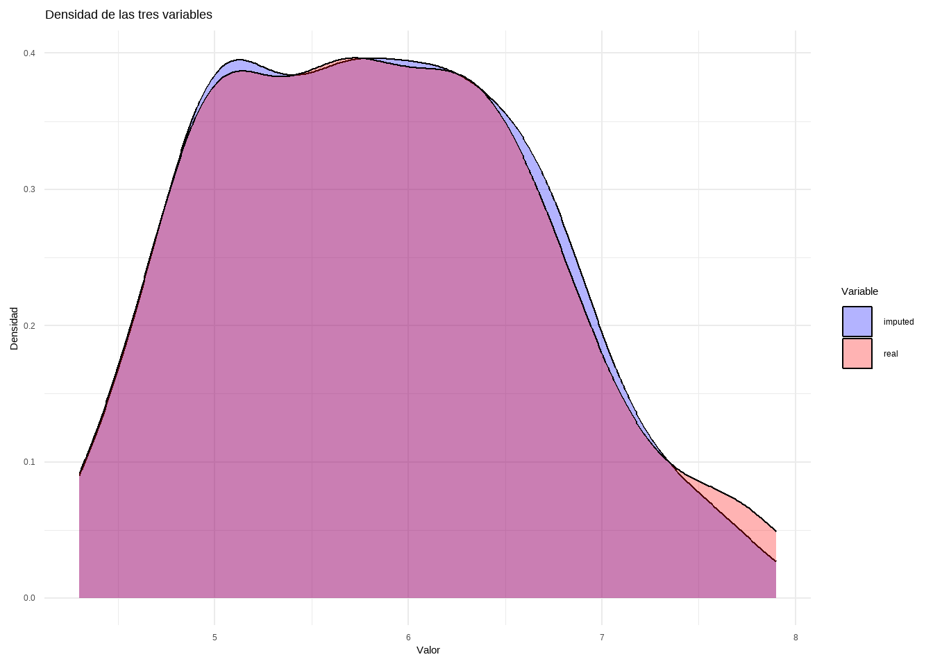 newBD <-data.frame(real = iris[, "Sepal.Length"], imputed = iris.imp$ximp[, "Sepal.Length"])df_long <- newBD %>%pivot_longer(cols =everything(), names_to ="Variable", values_to ="Valor")ggplot(df_long, aes(x = Valor, fill = Variable)) +geom_density(alpha =0.3) +# Transparencia para mejor visualizaciónlabs(title ="Densidad de las tres variables",x ="Valor",y ="Densidad") +theme_minimal() +scale_fill_manual(values =c("blue", "red"))
