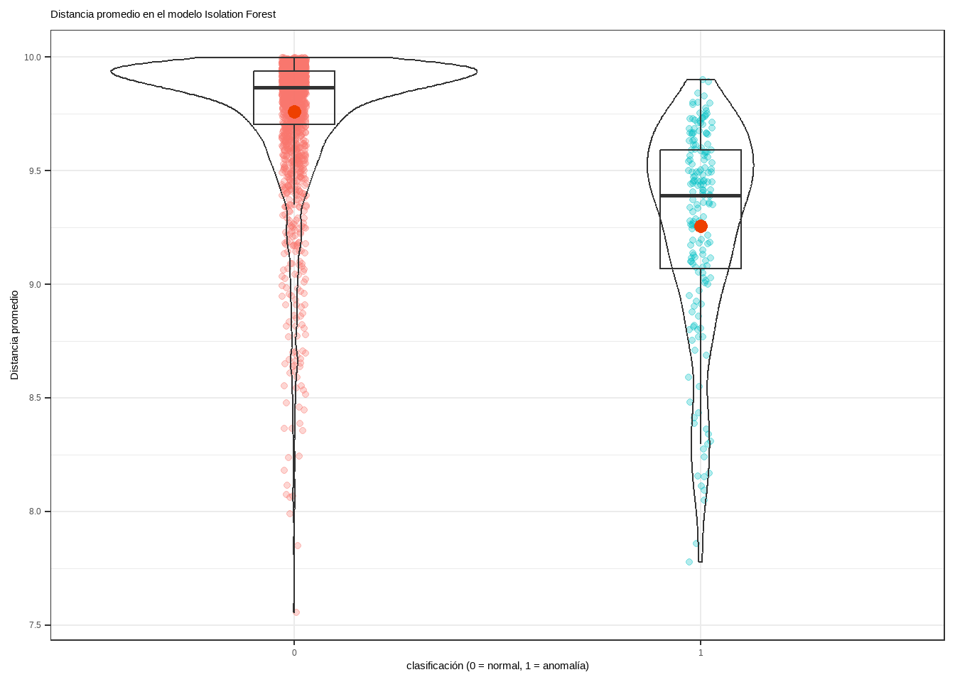 datos <- datos %>%bind_cols(predicciones)ggplot(data = datos,aes(x = y, y = average_depth)) +geom_jitter(aes(color = y), width =0.03, alpha =0.3) +geom_violin(alpha =0) +geom_boxplot(width =0.2, outlier.shape =NA, alpha =0) +stat_summary(fun ="mean", colour ="orangered2", size =3, geom ="point") +labs(title ="Distancia promedio en el modelo Isolation Forest",x ="clasificación (0 = normal, 1 = anomalía)",y ="Distancia promedio") +theme_bw() +theme(legend.position ="none",plot.title =element_text(size =11) )