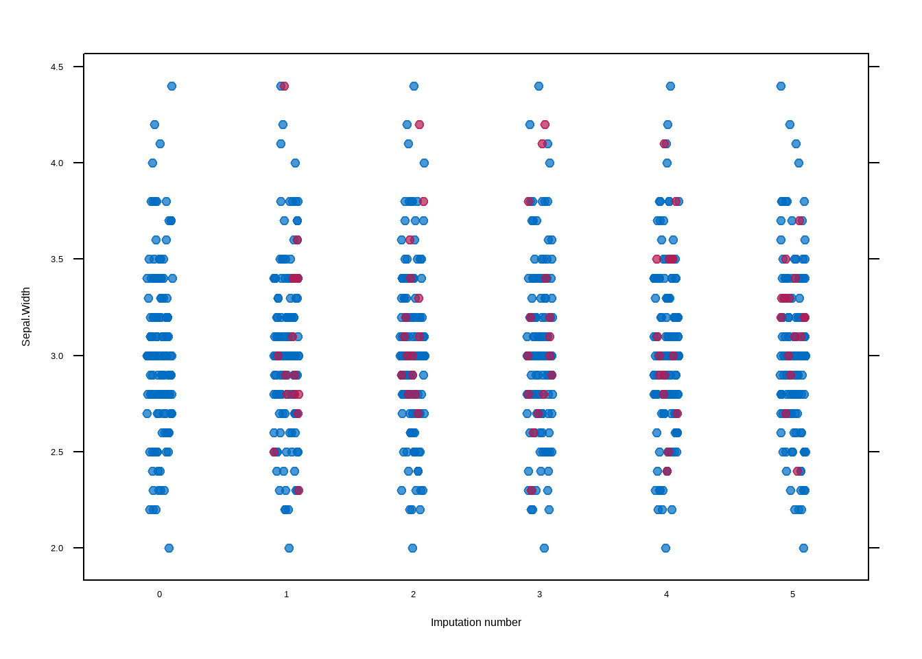 Revisamos la variable Sepal.Length con la imputación realizada en cada una de las rondas.