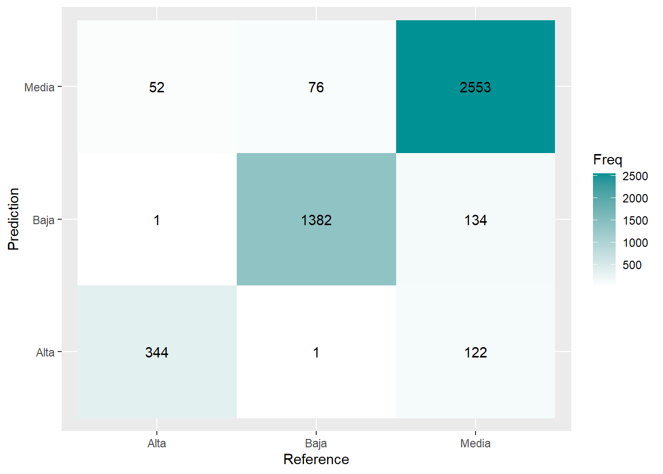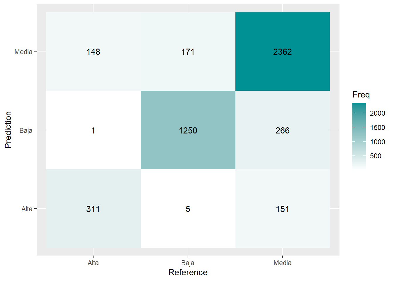 CM <- caret::confusionMatrix(prediccion, as.factor(rtest$RENTA)); CM <- data.frame(CM$table)
